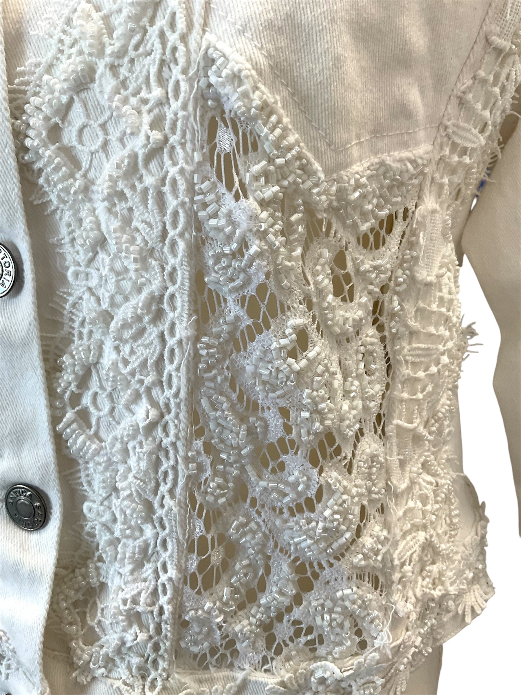 Upgrade your wardrobe with the Angel Sequin Beaded Jacket, a chic white Italian denim piece adorned with detailed sequin beadwork on the front, back, and cuffs. This lightweight, comfortable cropped jacket provides a flattering tailored fit, making it perfect for extended wear and suitable for a variety of events. Expertly crafted, it blends sophisticated design with practical style.