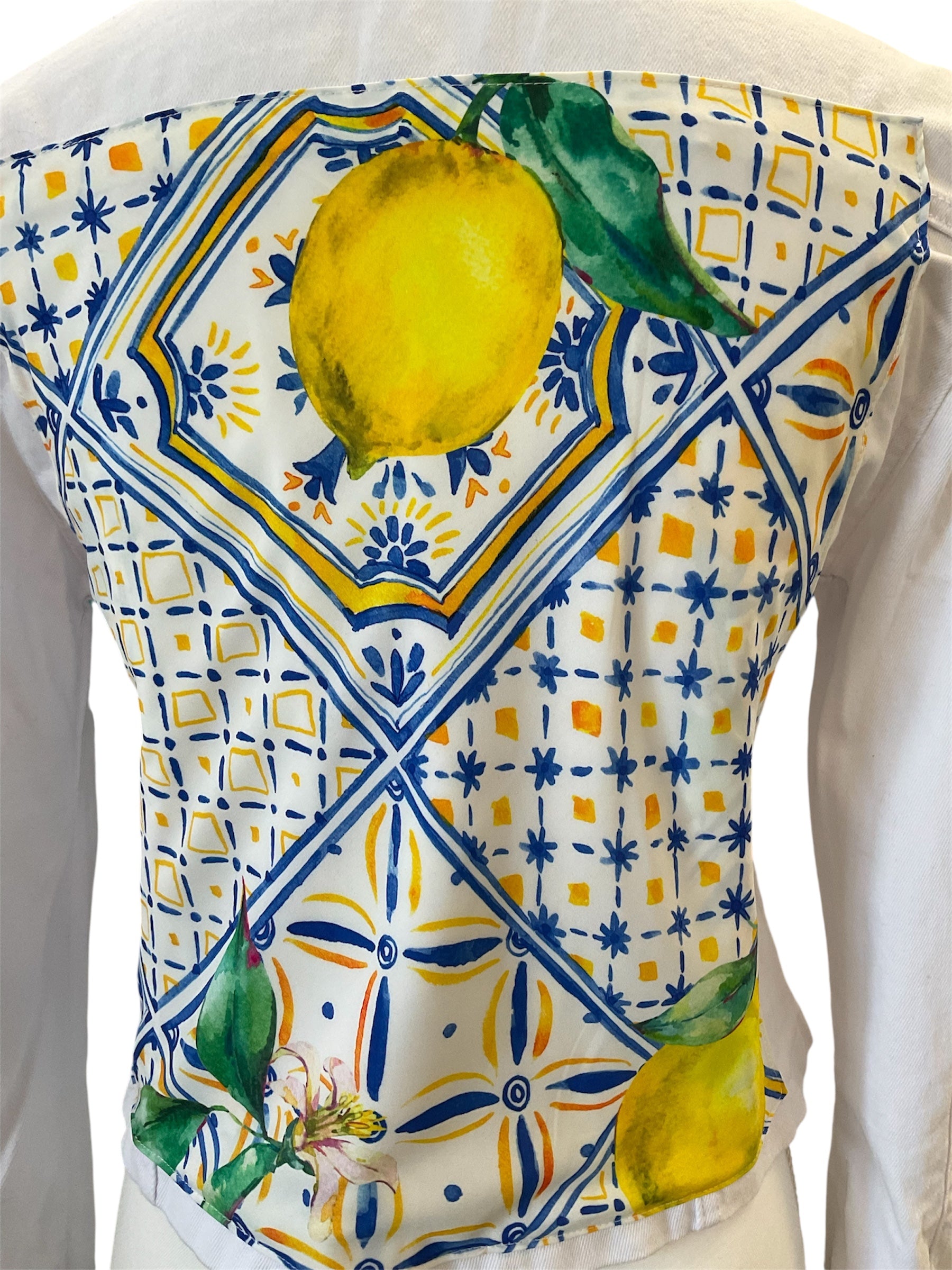 Give your wardrobe a fun Italian upgrade with this White Italian Denim Jacket. Bright silk details inspired by Italy decorate the back, collar, pocket flaps, and cuffs, adding a lively pop of color. Lightweight and comfy, it’s perfect for wearing all day. The cropped, distressed style gives your outfits a trendy, playful edge that's sure to turn heads.