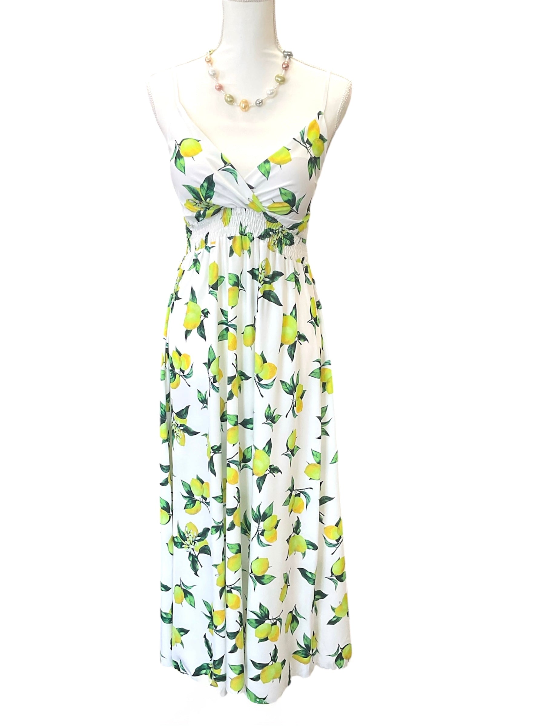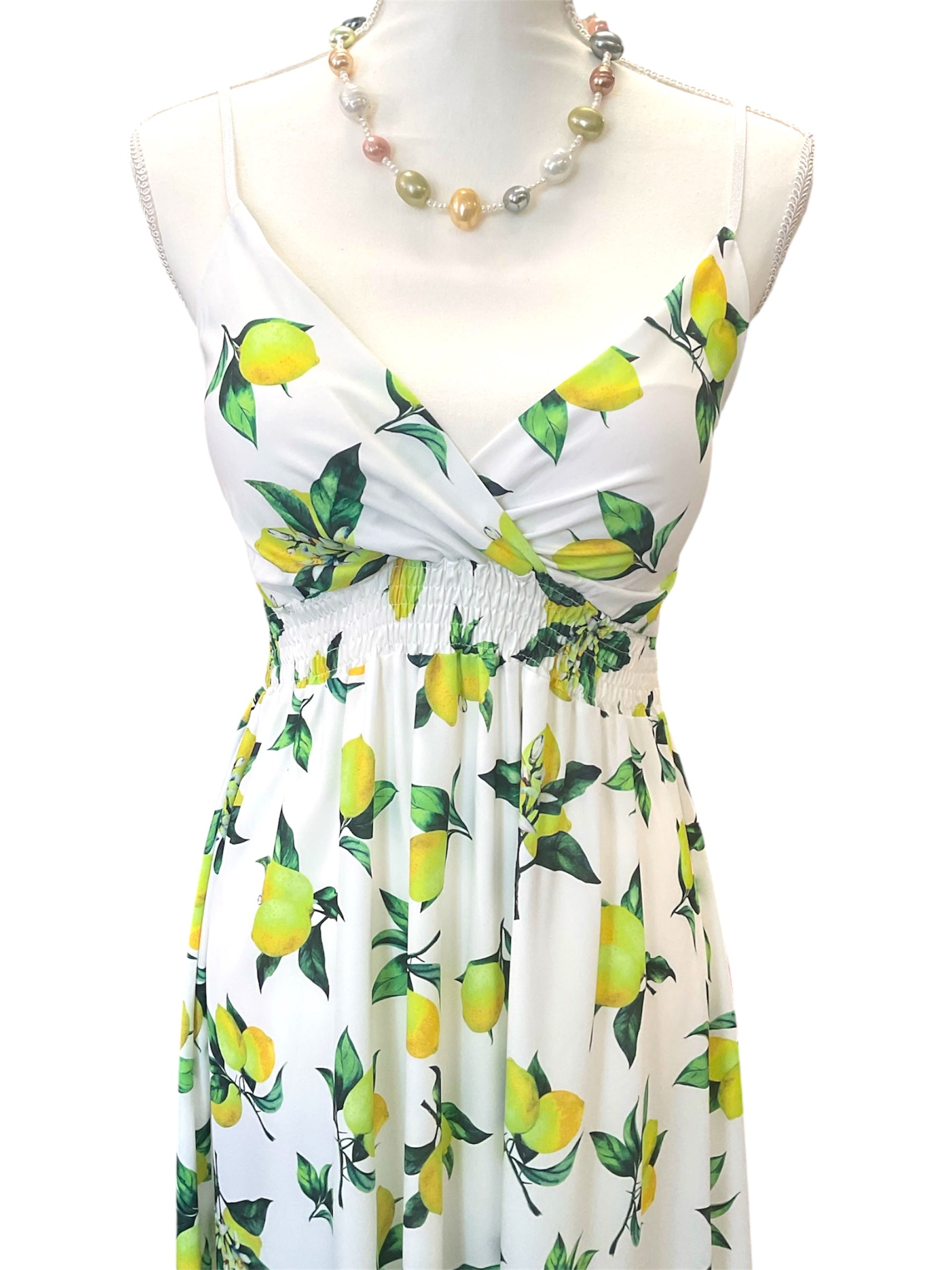Celebrate summer's zest with the Limoncello Dress, handmade in Italy featuring vibrant lemon accents. Its delicate spaghetti straps create a breezy silhouette that flatters your figure—ideal for injecting a fun and sunny burst of energy into your warm-weather wardrobe.